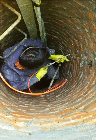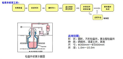 检查CIPP内衬修复是管道非开挖内衬修复技术的延伸。按照检查井的构造和尺寸。设计加工内衬材料并灌浸树脂。运到工地后将其吊入需要修复的检查井内。然后利用压缩空气或水将材料膨胀后紧贴于井内壁,采用温水循环加热系统使材料固化后。即在旧井内形成一个内胆。最后将井口切开并安装塑料爬梯后竣工。