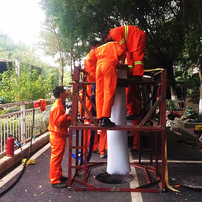 翻转式原位固化法修复是一种排水管道非开挖现场固化内衬修复方法。将浸满热固化性树脂的毡制软管利用注水翻转将其送入已清洗干净的被修管道中,并使其紧贴于管道内壁,通过热水加热使树脂在管道内部固化,形成高强度内衬树脂新管。